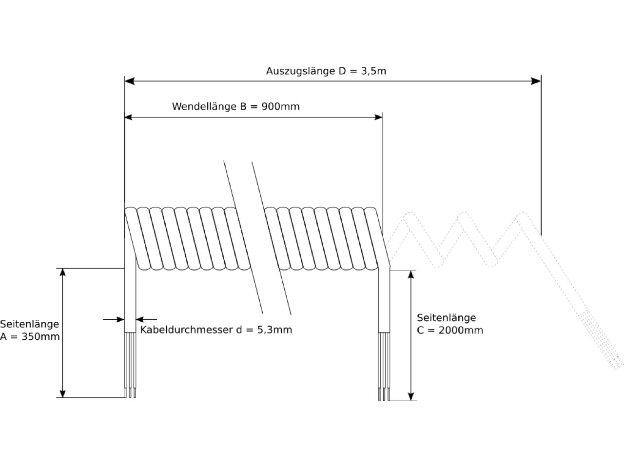 Câble spiralé pour portes, noir, configuration de câble: torons fins 4x0,25mm², Lif9Y11Y, PP/ TPU ether, dimensions: extrémité gauche = 350mm, longueur spiralée = 900mm, extrémité droite = 2000mm, max. longueur d'extension 3,5m