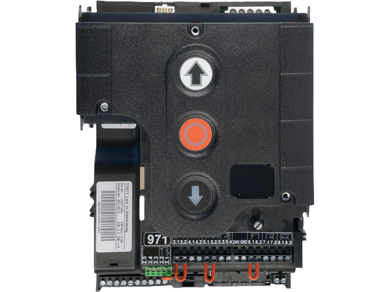 Le coffret de commande de porte TS 971 par GfA Elektromaten est un panneau de commande automatique à utiliser avec les motorisations GfA Elektromaten avec fin de course numérique (DES) ou mécanique (NES). Le coffret de commande TS 971 est livré avec un récepteur radio intégré pour les produits radio 434 MHz de différents fabricants et un module de réception radio pour le dispositif de sécurité GfA WSD.