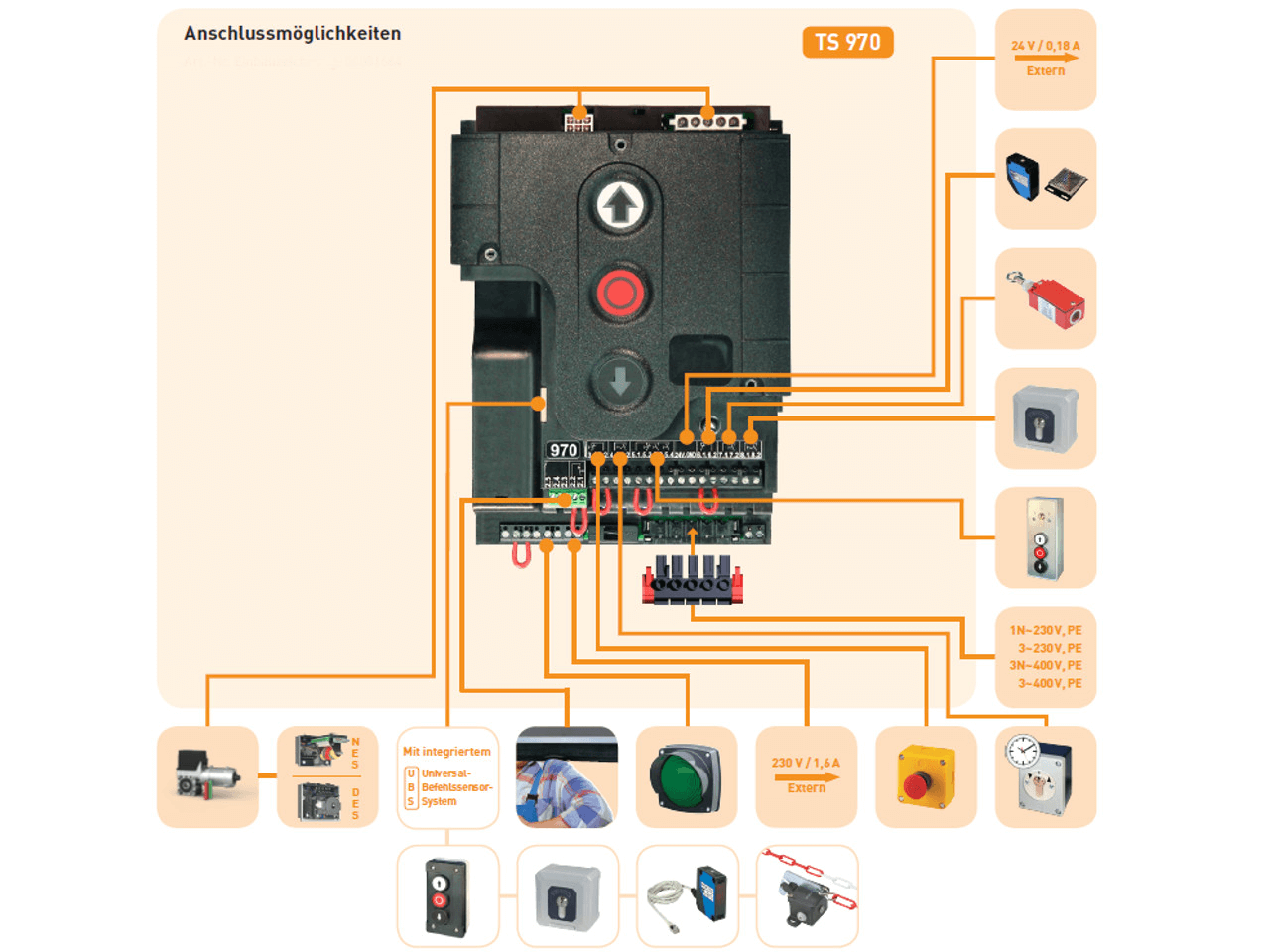 Grâce au câble moteur préassemblé et enfichable, le TS 970 peut facilement être connecté au moteur. Un mauvais câblage est évité, minimisant ainsi les erreurs d'installation et le temps. Le câble de connexion peut être raccordé au coffret de commande par le haut ou le bas. En plus du câble moteur, le TS 970 peut fonctionner avec une multitude d'entrées supplémentaires, par ex. interrupteurs à corde, cellules photoélectriques, barres palpeuses et beaucoup plus.