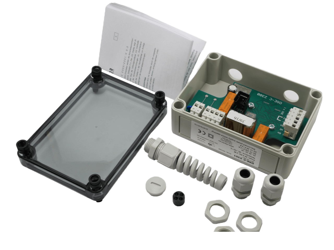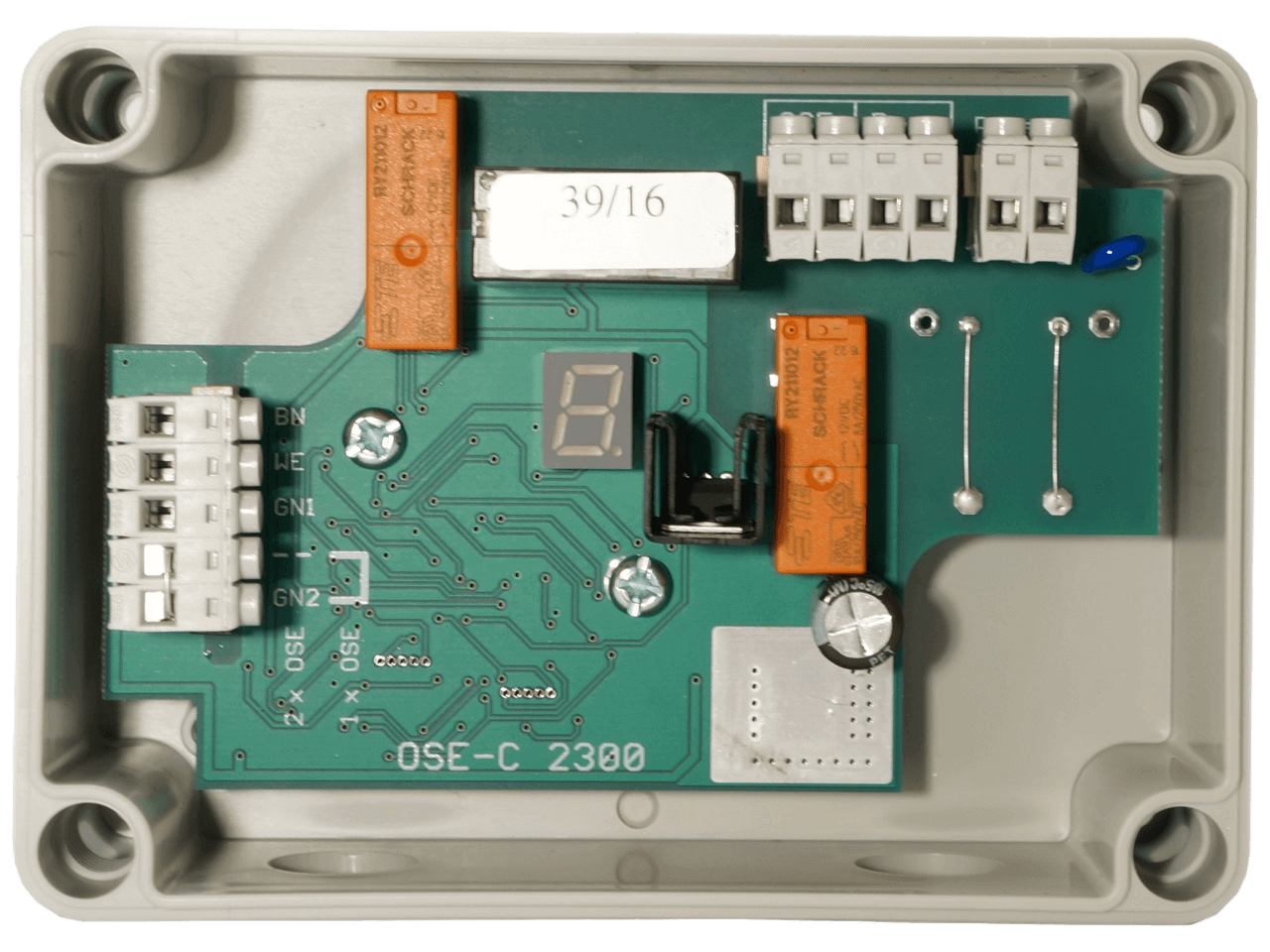 The FRABA VITECTOR OSE-C 2301 is a control unit for optical sensing edges on doors. The control unit can monitor and evaluate up to two optical sensing edges type (FRABA VITECTOR OSE) or two pull-in protection devices (type FRABA VITECTOR RAYTECTOR). Thereby, the security signal of the sensors can be converted via the evaluation of the OSE-C 2300 into a potential-free NC relay contact. As well as the safety output, the OSE-C2301 also delivers a NO relay contact which e.g. can be used to reverse the door when operating the safety edge.