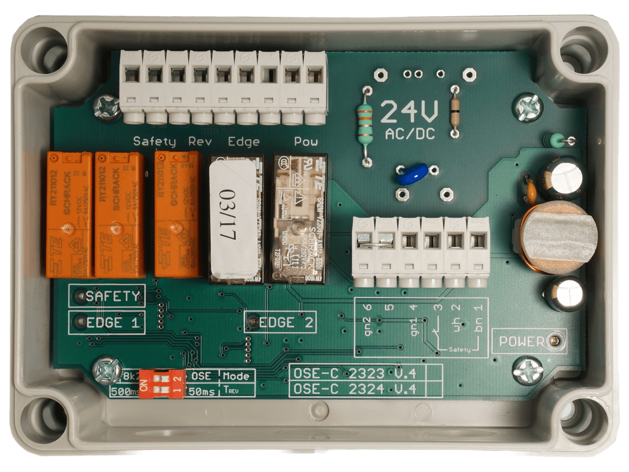 Control unit for optical sensing edges OSE or 8k2 resistive edges, relay output (stop, reverse and cable tension switch), monitors up to 2 sensing edges, IP65 enclosure, supply voltage 24 V AC/DC, rated Cat. 3 PL d (EN 13849-1)
