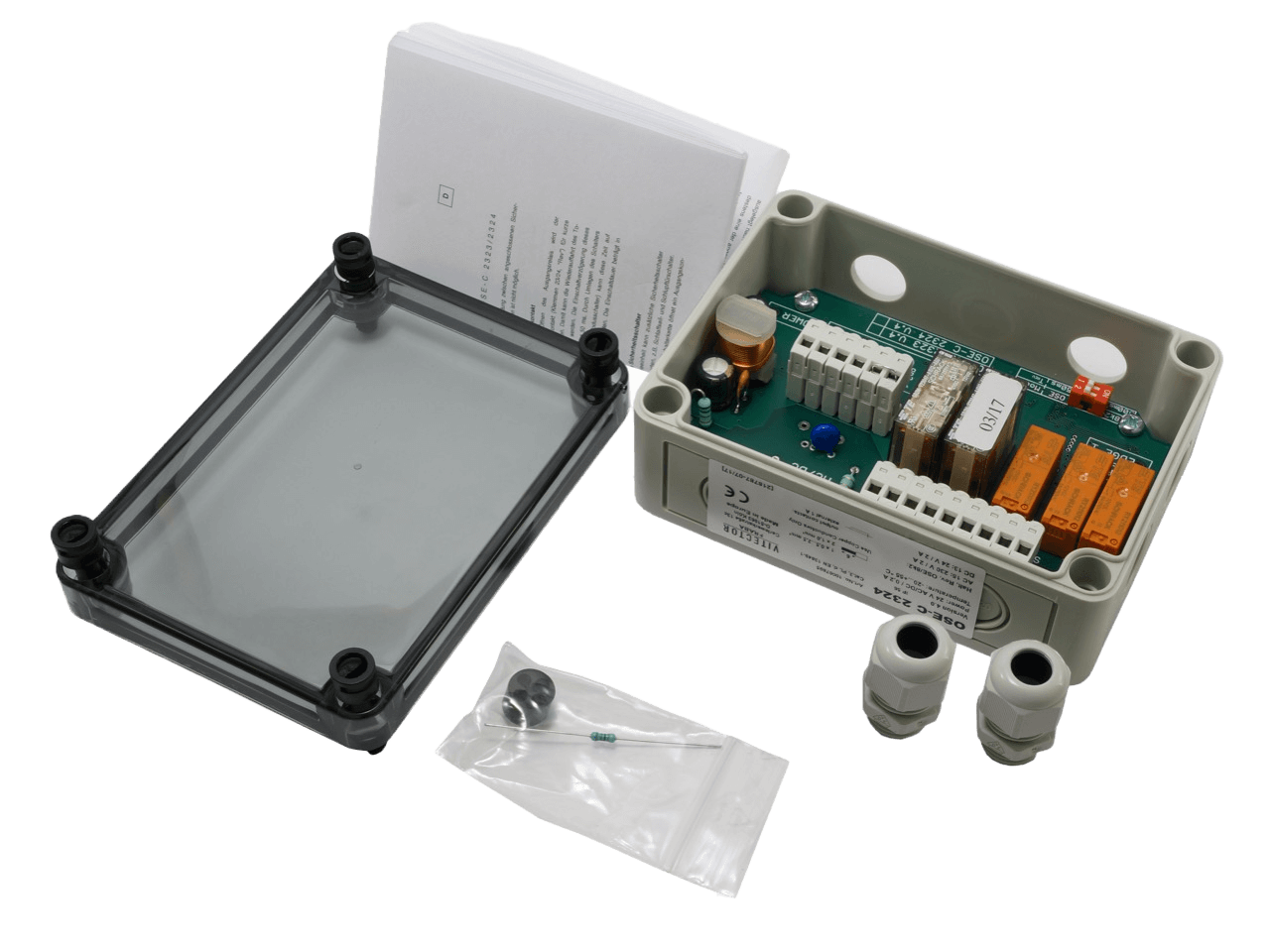 The FRABA VITECTOR OSE-C 2324 is a control unit for optical sensing edges on doors. The control unit can monitor and evaluate both optical sensing edges (type FRABA VITECTOR OSE) and resistant sensing edges with a terminal resistance of 8k2 Ohm. Besides this, a stop circuit (e.g. slack-rope switch and pass-door switch) can be monitored with this device.