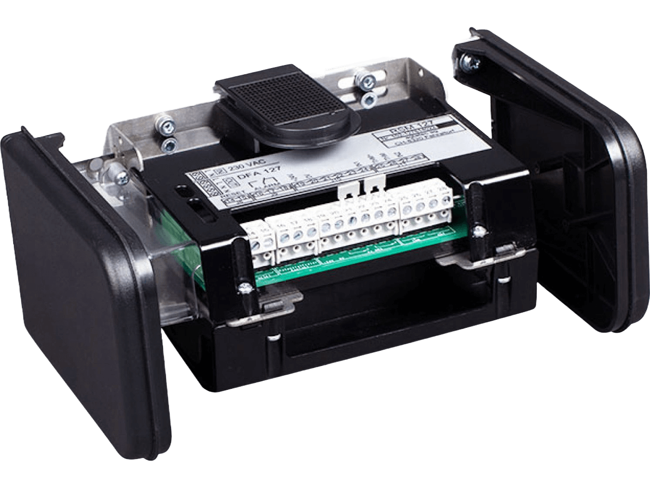 Record RSM 127 FS 108 Smoke detector module for the control of hold-open devices and fire and smoke protection doors; included in delivery: power supply unit, optical smoke detector, electronics board with connection for the locking mechanism (magnet), release mechanism (push-button) as well as external smoke or thermal switches; housing with stainless steel cladding, 200 x 110 x 126 mm (L x H x D).
