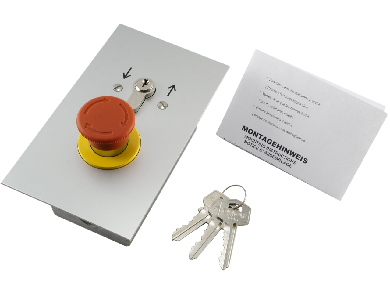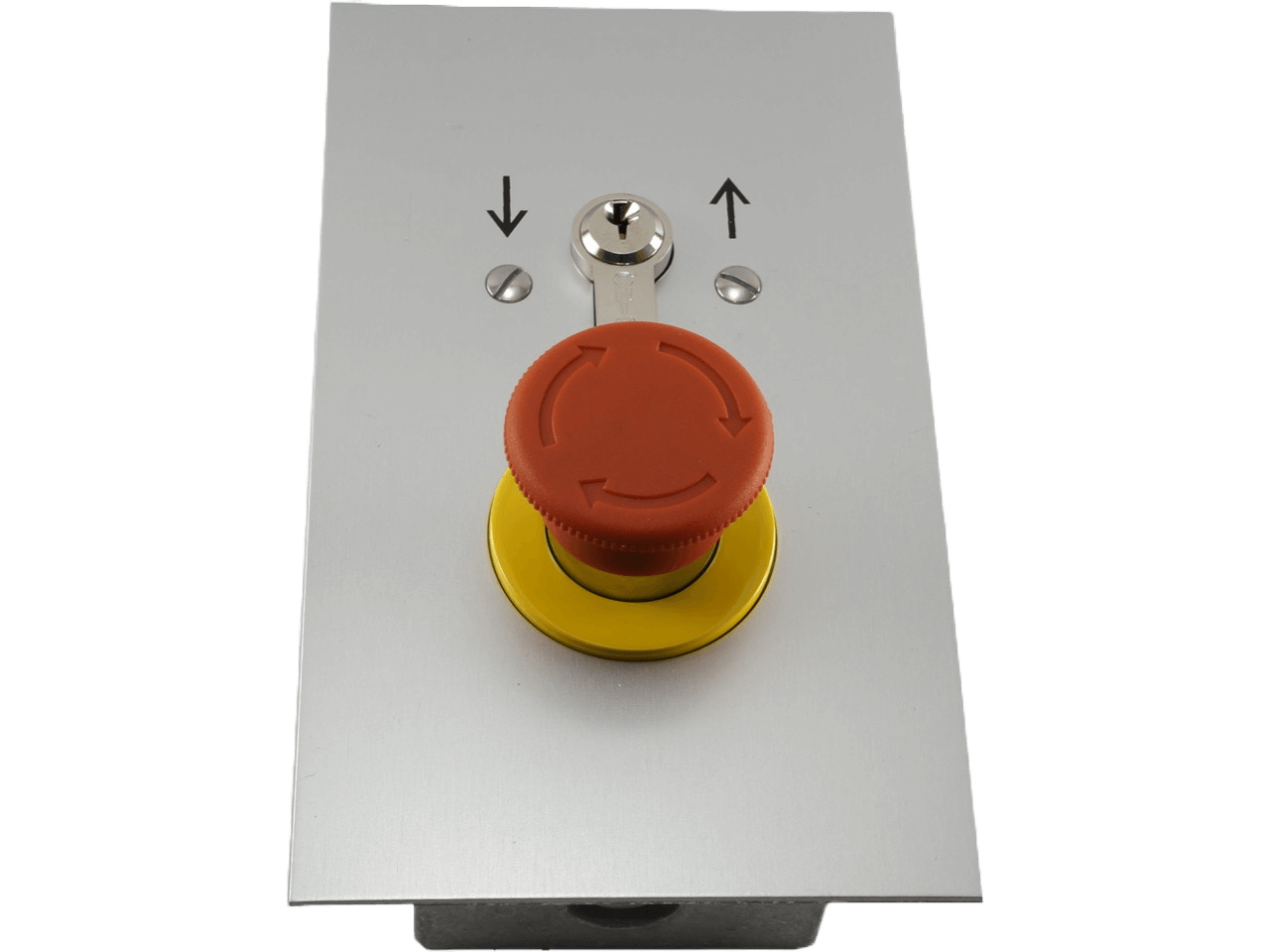 Interrupteur à clé dans un boîtier à encastrer, en aluminium, avec indice de protection IP55, interrupteur d'impulsion à deux côtés, fonction haut/bas et bouton d'arrêt d'urgence, avec serrure à cylindre et 3 clés